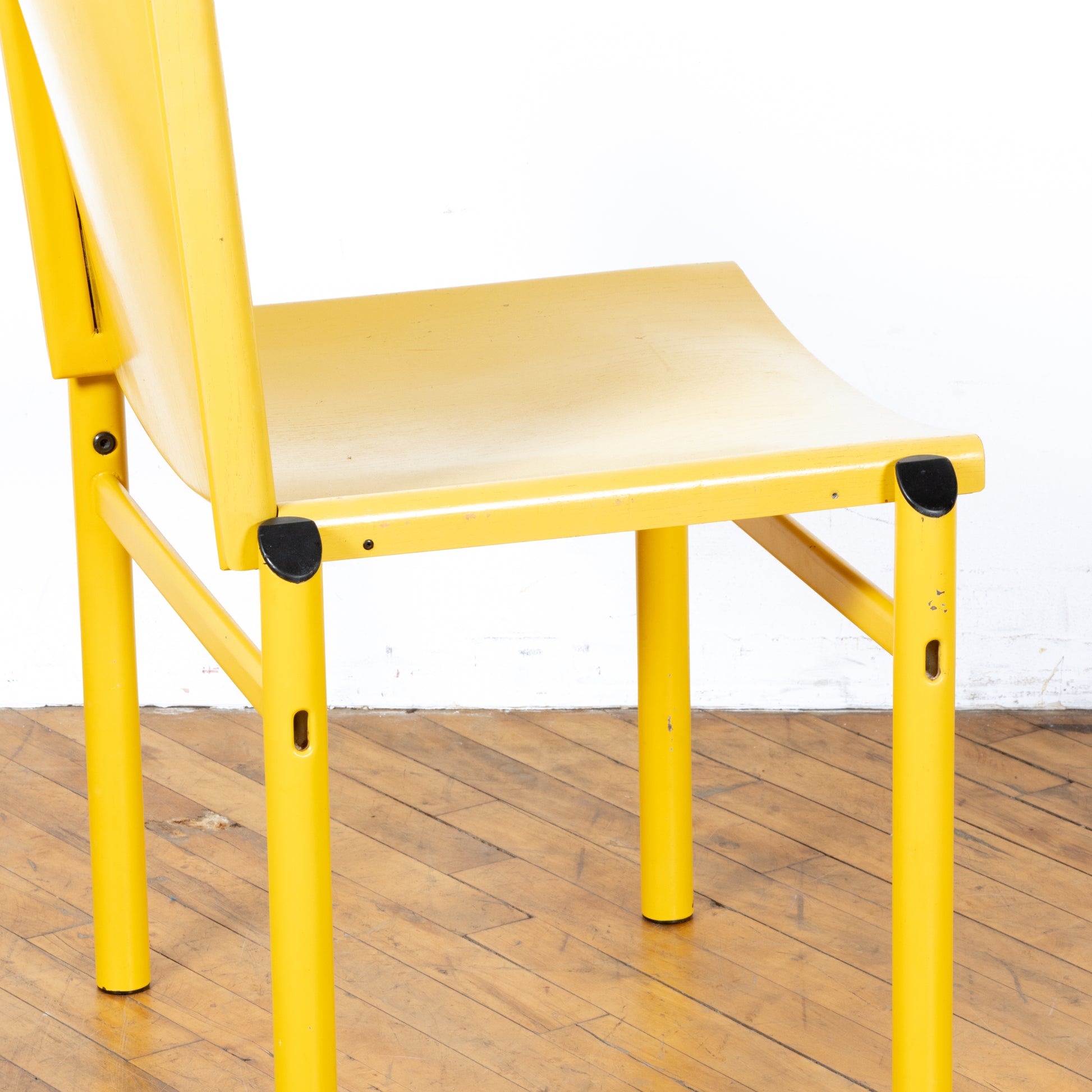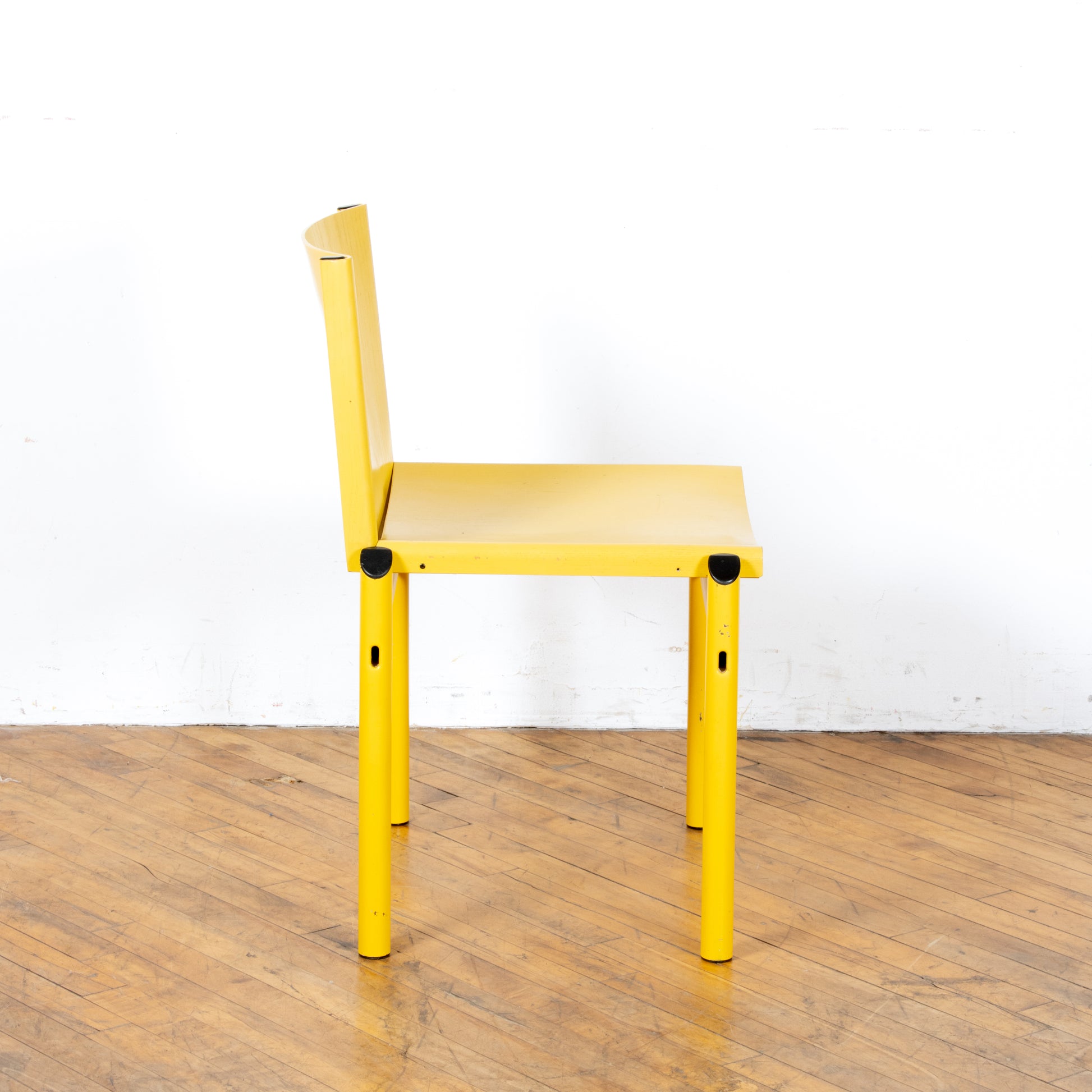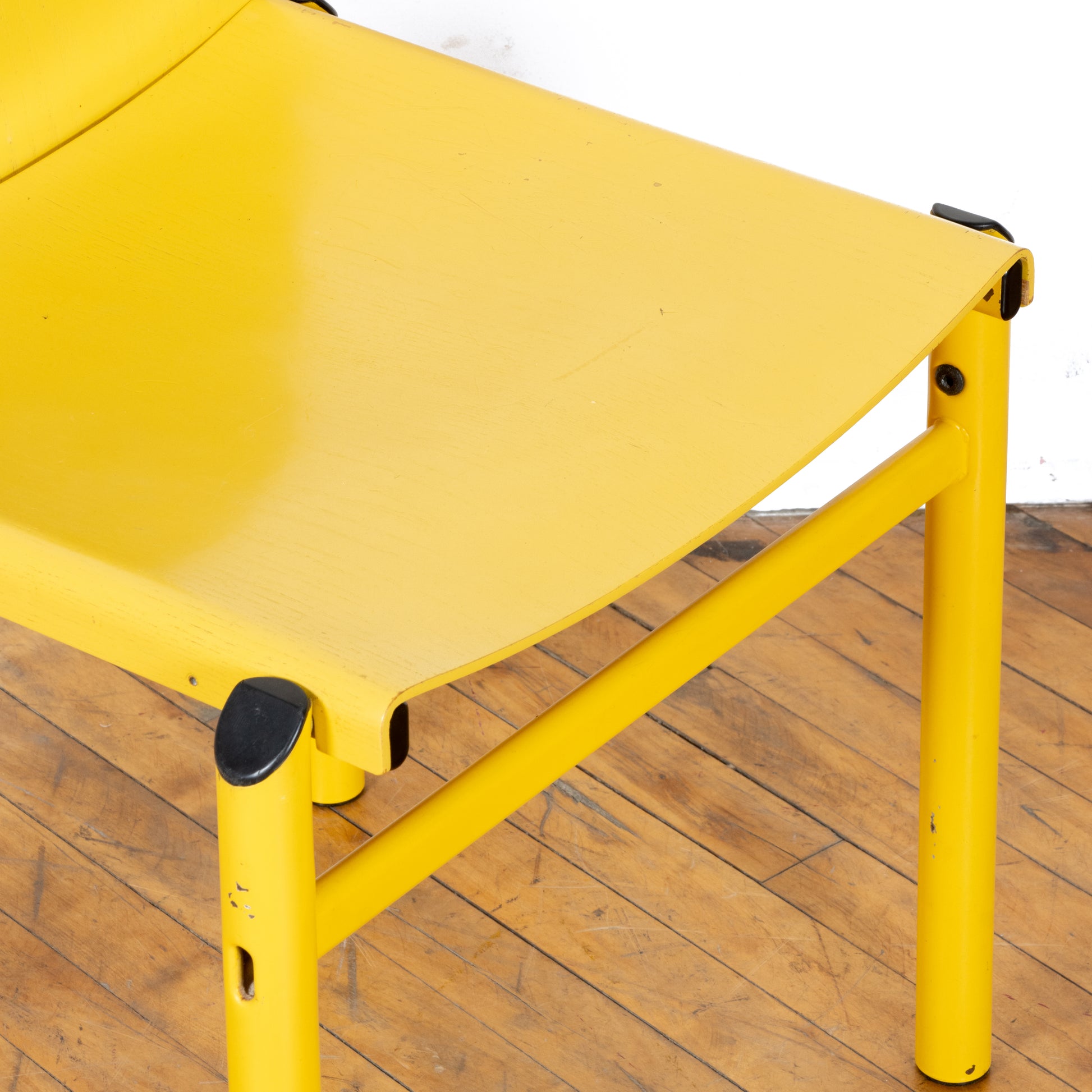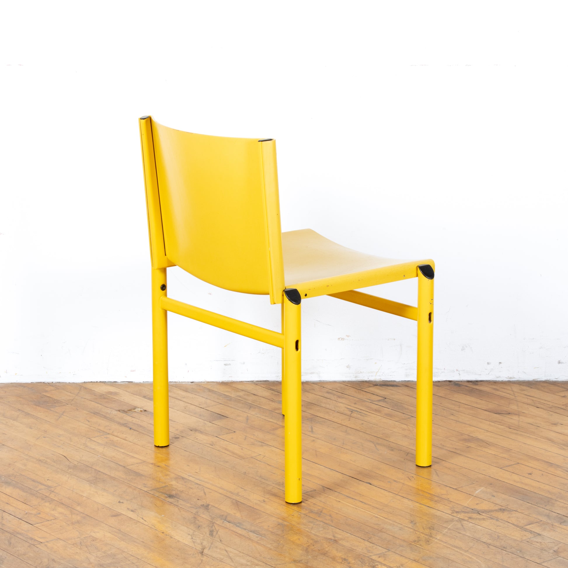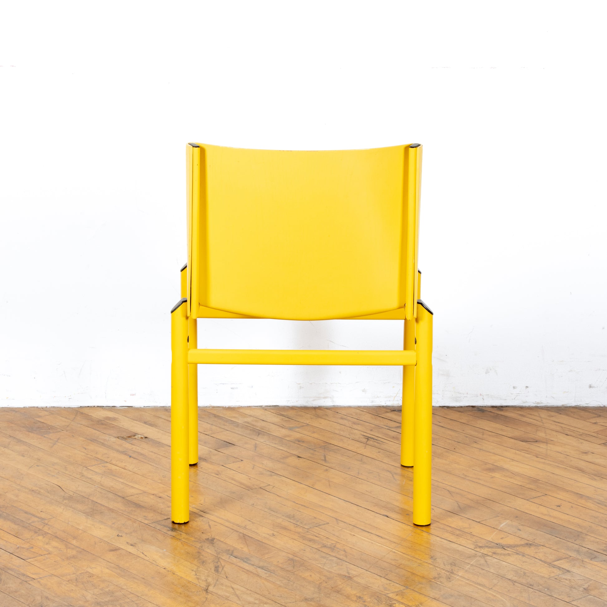 Uncommon Afra & Tobia Scarpa "Mastro" chair, made in Italy circa 1981. This is a model not often available outside of the European market. A molded ply seat rests upon a tubular steel frame both in a matching soft canary yellow. Chair shows age appropriate wear with some small chips in the paint both on the legs and the seat. Missing one rivet, but doesn't effect functionality. See photos for details. Nationwide shipping and local delivery available. Please write with any questions prior to purchase. All sales final.