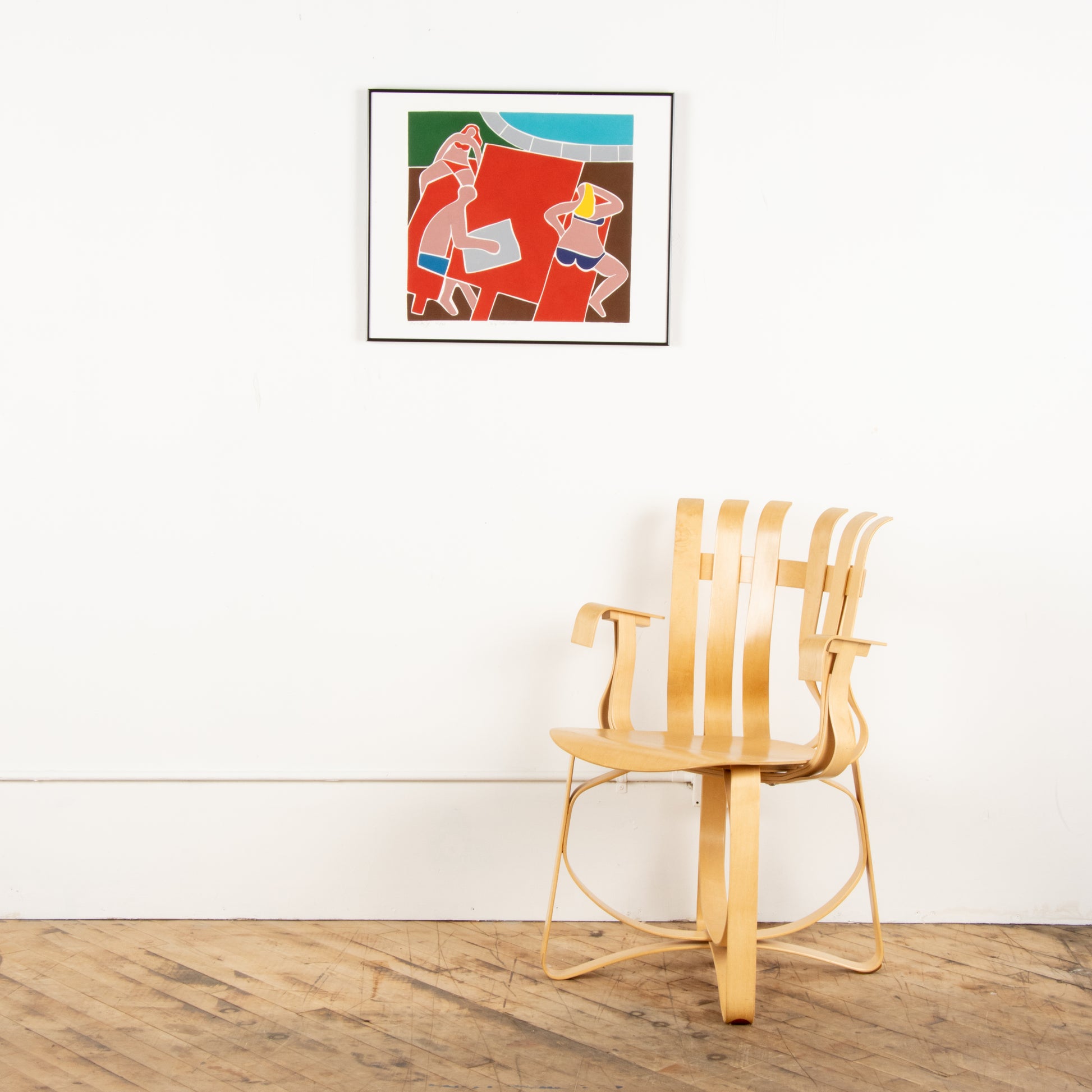 1979 Screen print by California artist Dan May titled "Nudes Near Pool." 21 of 30. Taking after Henri Matisse and David Hockney, much of his work utilizes bold colors and a playful, poppy aesthetic. Set in a black aluminum frame with glass glazing. This one of his earlier pieces and has a charming looseness to the print quality. Nationwide shipping and local delivery available. Please contact with questions prior to purchase. All sales final.