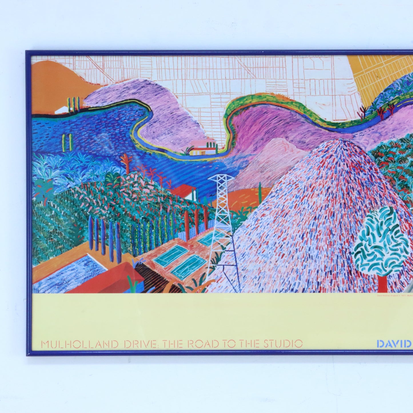 Vintage 1980 David Hockney Los Angeles County Museum of Art exhibition poster featuring "Mulholland Drive: The Road to the Studio." Set in a 1" thick aluminum frame with glass glazing. Print is in great vintage condition, minor age appropriate wear to the frame.