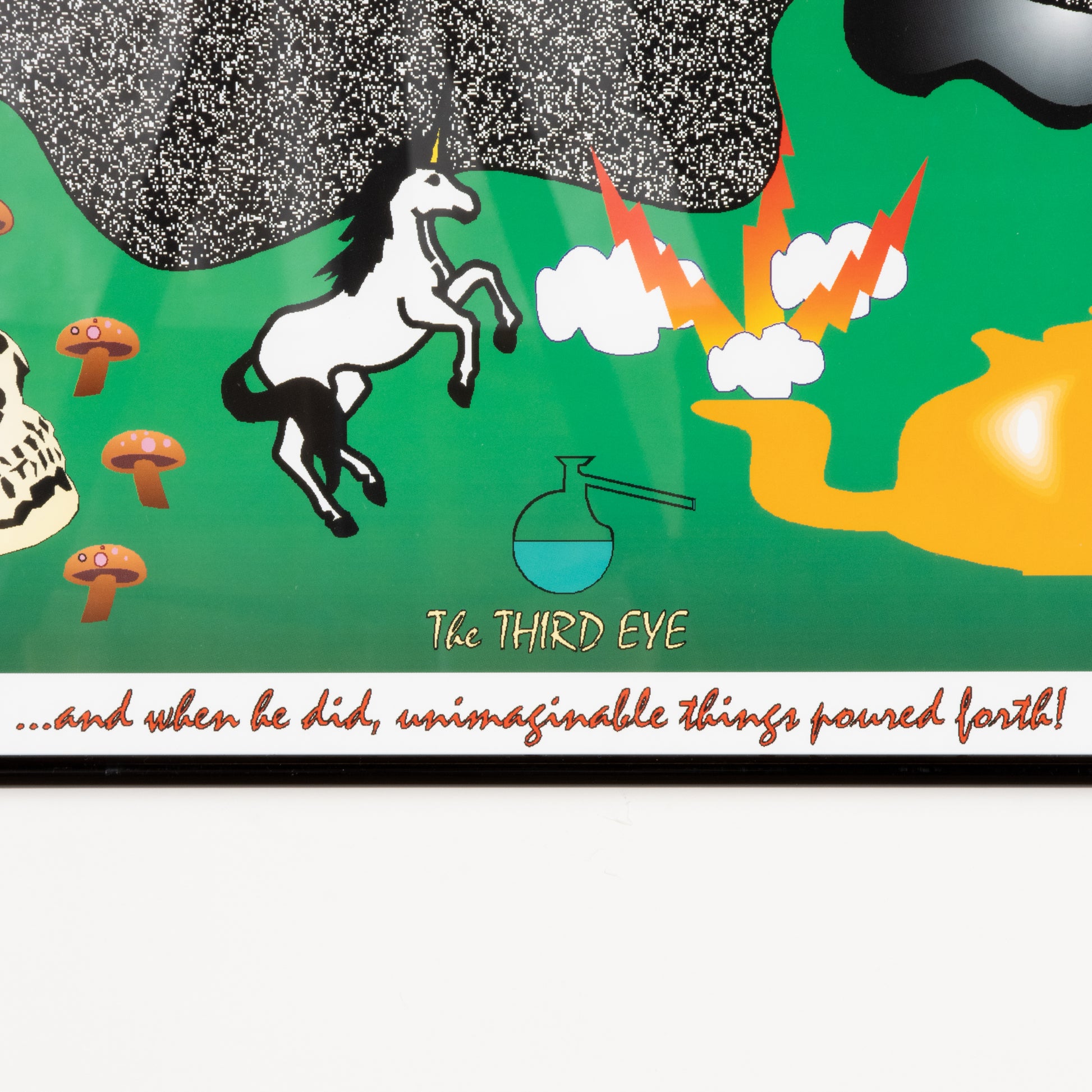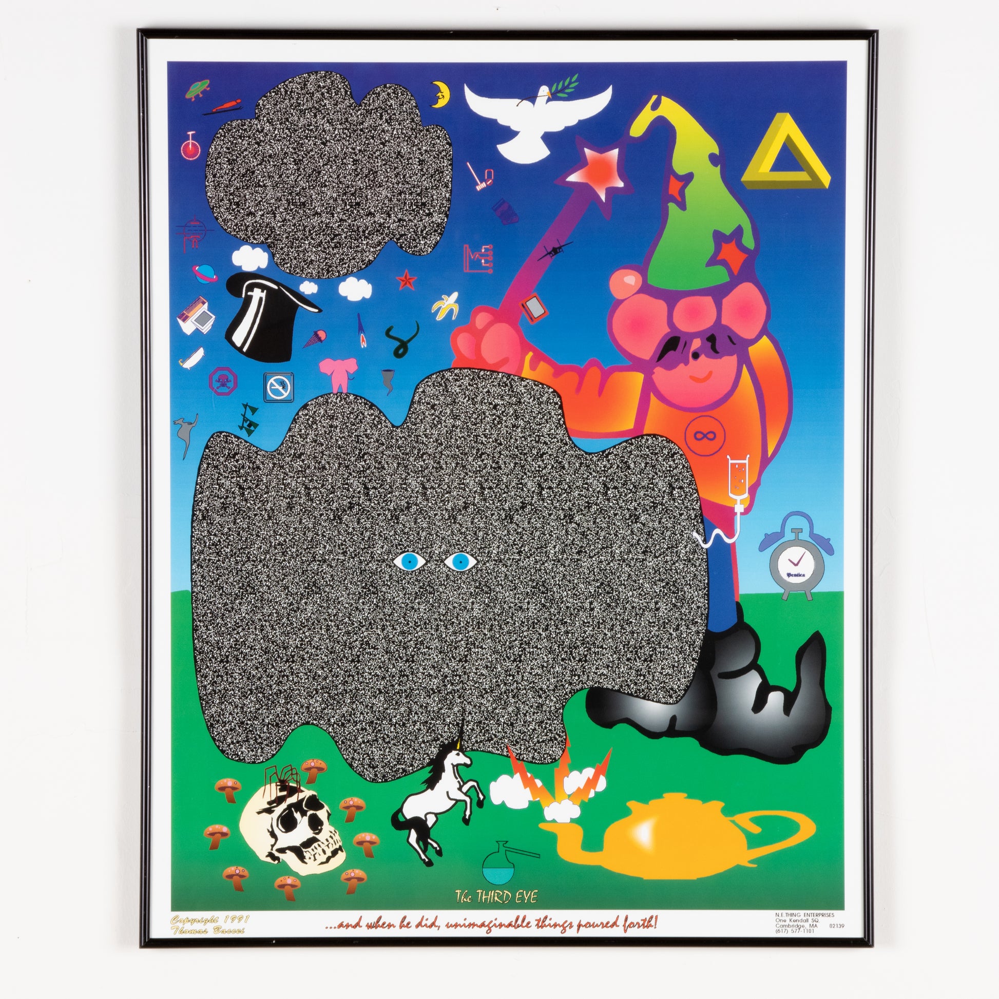 Wild style 1991 digital art poster "The Third Eye" by Thomas Baccei. Lots going on here. Paraphernalia clip art galore. Nationwide shipping and local delivery available. Please contact with questions prior to purchase. All sales final.