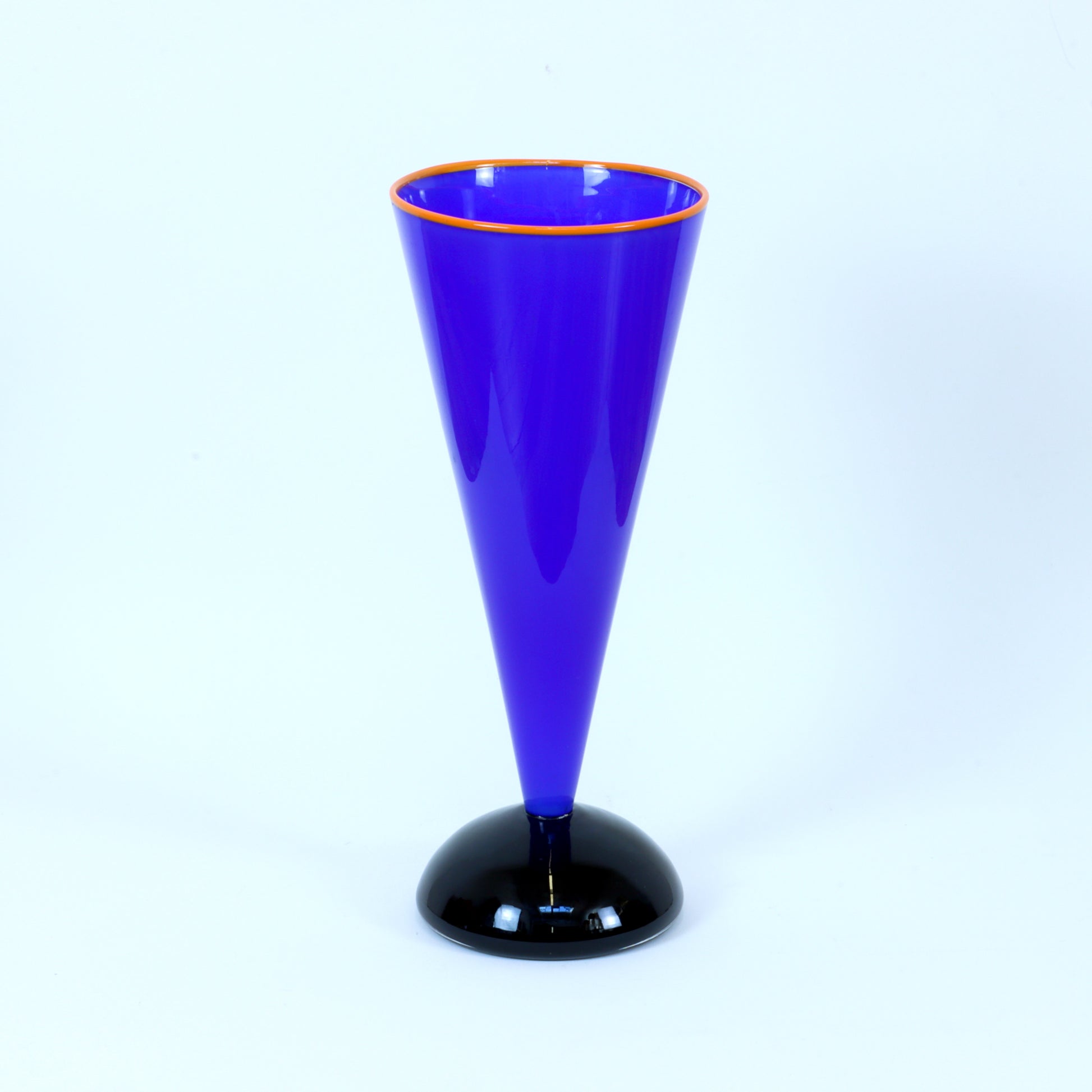 1991 Postmodern glass vase from Ibex glass studio. The following information from Tenon Design: "Formed in 1985 by Dimitri Michaelides, Sam Stang and David Levi, IBEX Glass Studio was heavily influenced by contemporary European design, mid-century Venetian glass, and early American studio glass pioneers. Ibex designs are right in line with work by late 1980s/early 1990s post-modern designers, like Sottsass and his Memphis contemporaries."