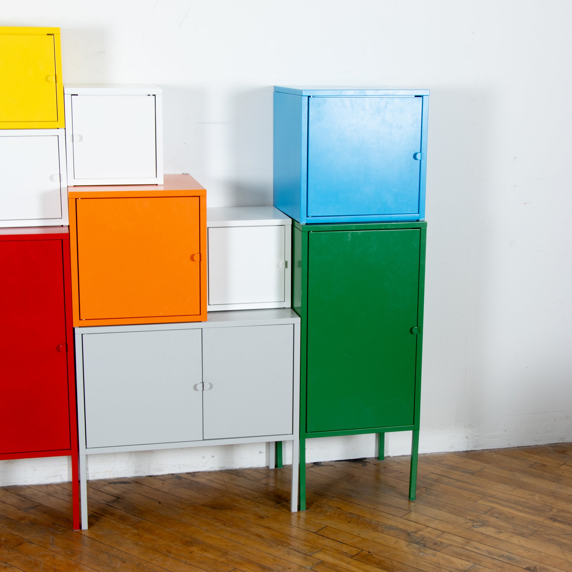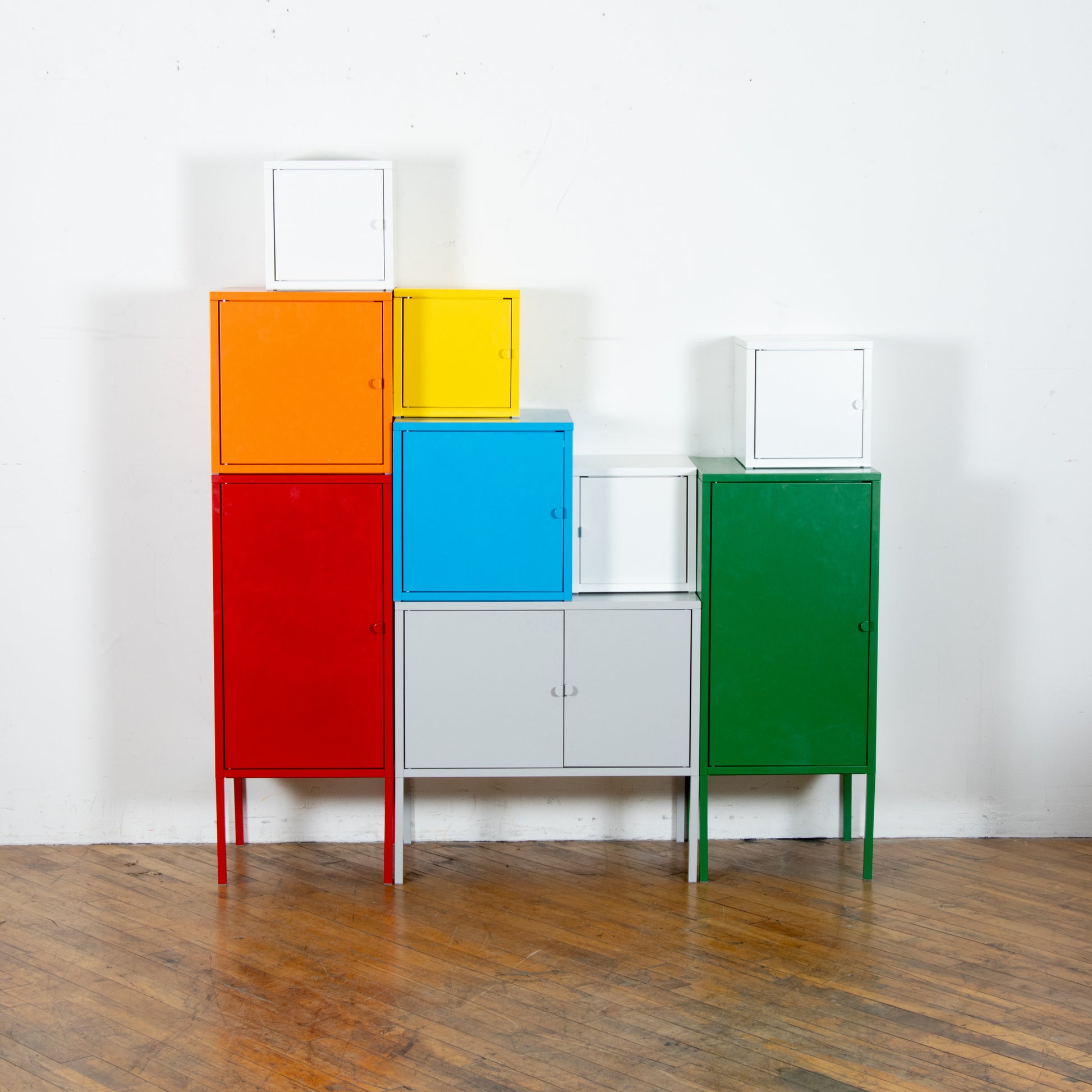 Modular "Lixhult" lockers designed by Jon Karlsson for IKEA in 2016. This set is in the discontinued colorful combo. Lockers can be constructed to the shape of your liking and connected on the back with simple hardware; they can also be wall mounted if you prefer. Doors can also switch directions. In overall good condition. Please contact for appointments, shipping and local delivery arrangements prior to purchase. All sales final.