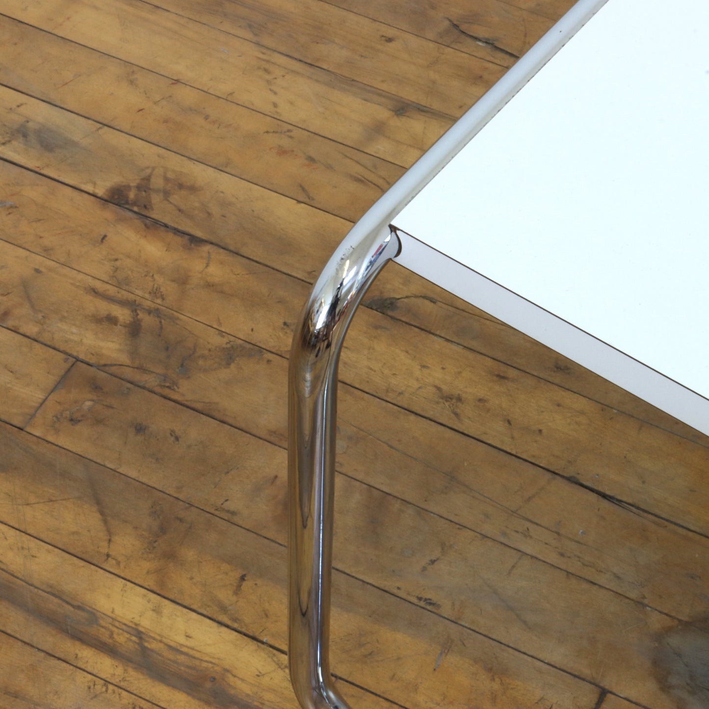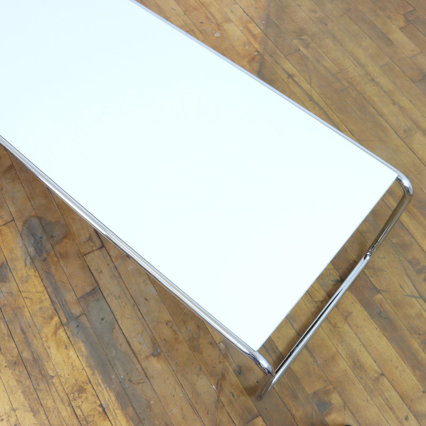 2000s Knoll production of Marcel Breuer's "Laccio" coffee table. White laminate top rests on a classic Bauhaus tubular steel frame. Can't go wrong with this classic and minimal design. Please contact for shipping and local delivery arrangements prior to purchase. All sales final.