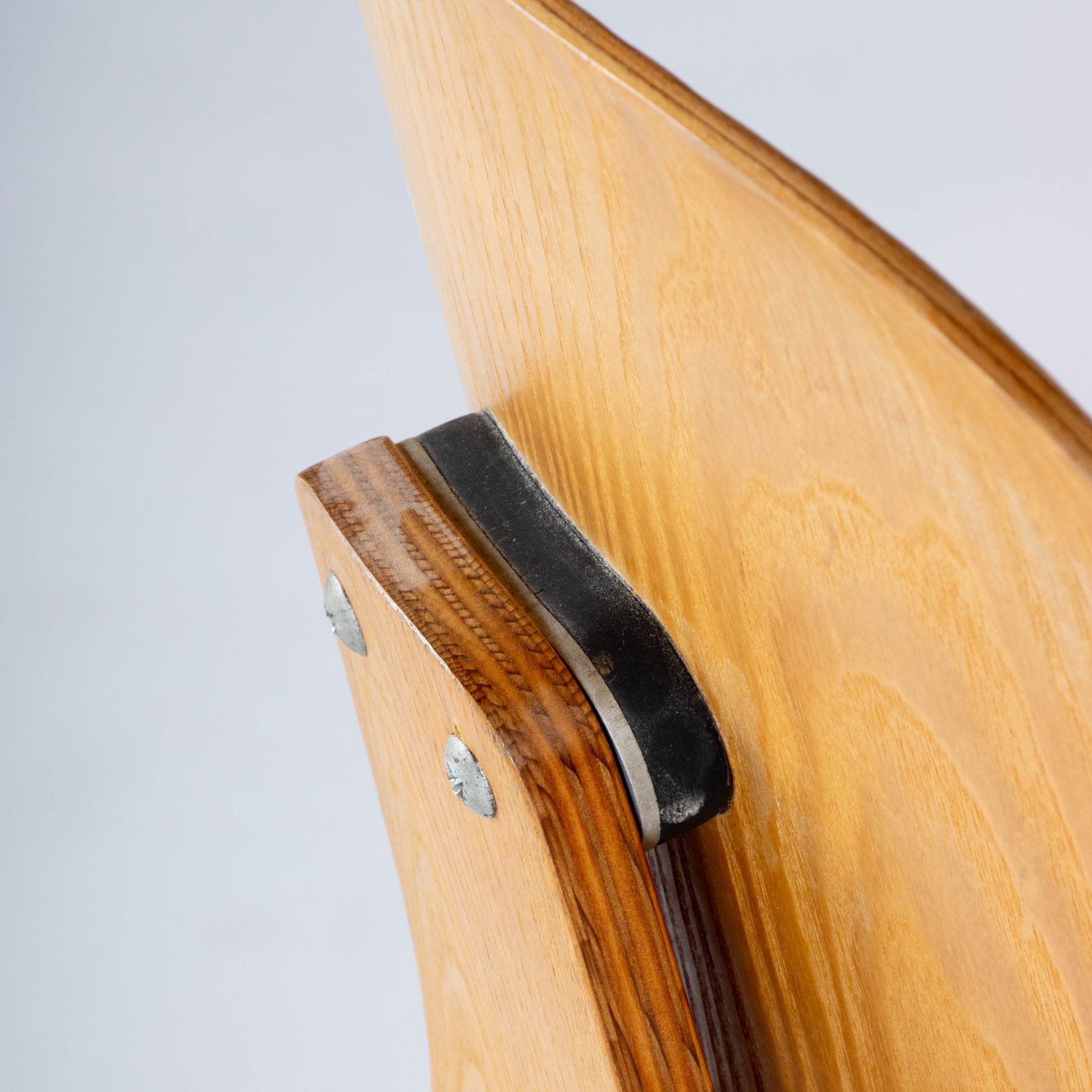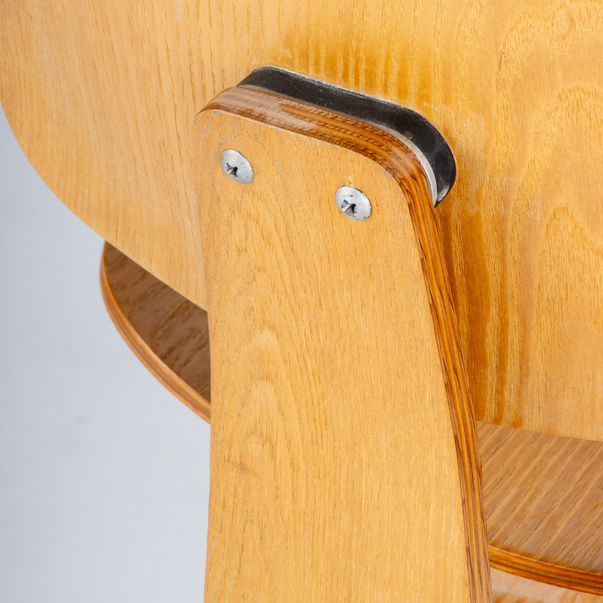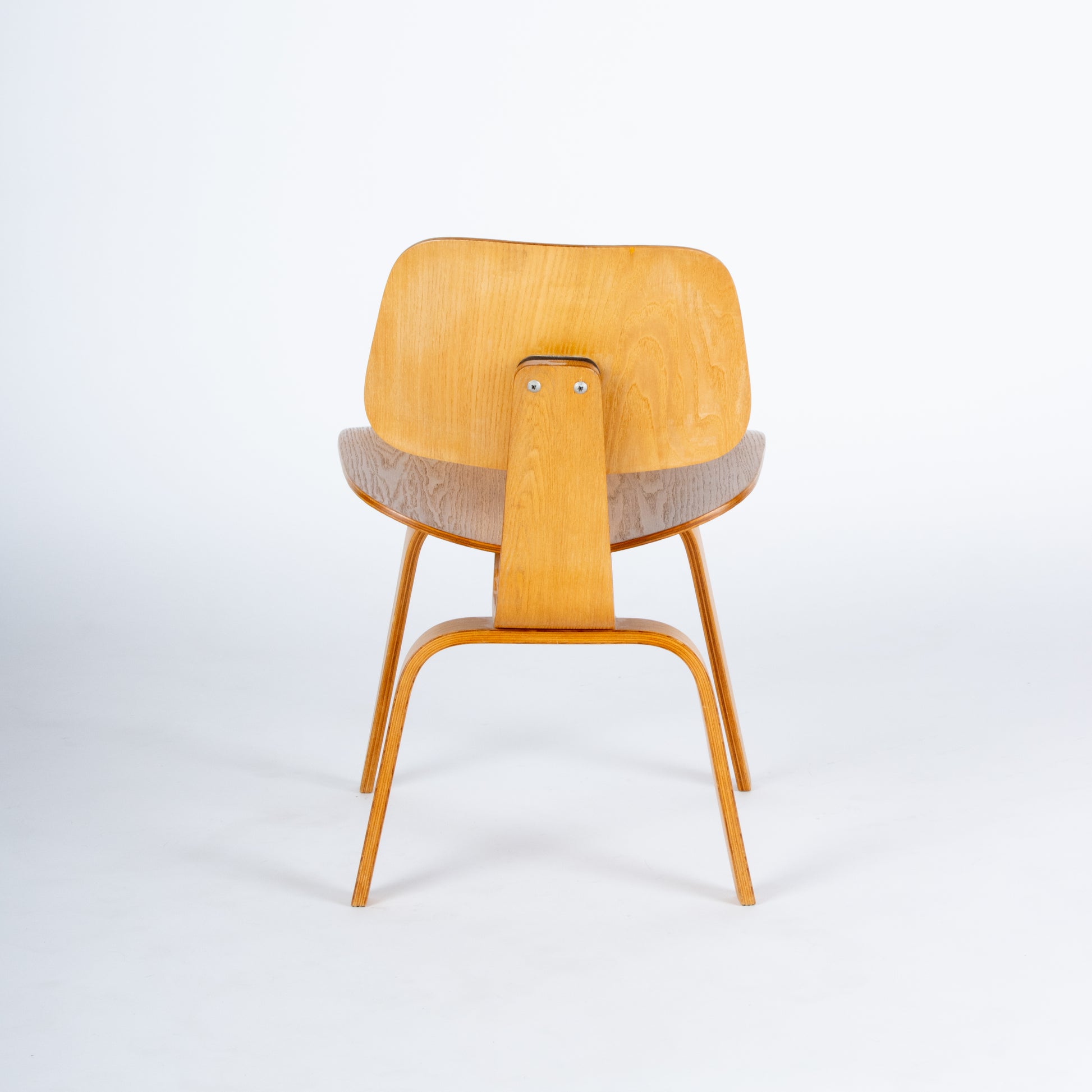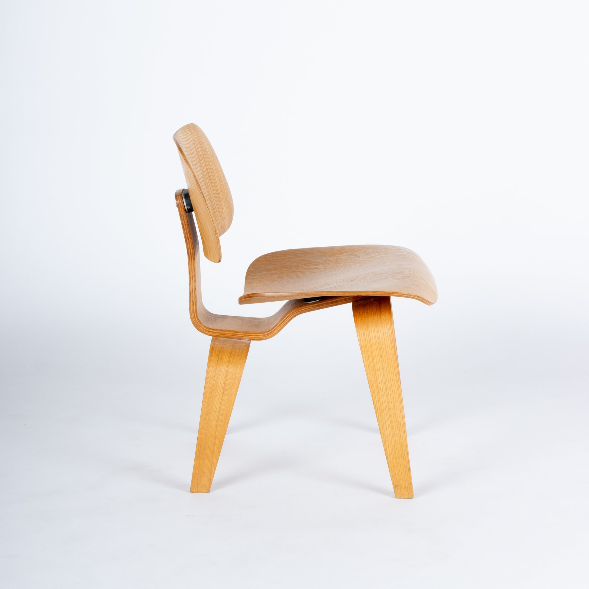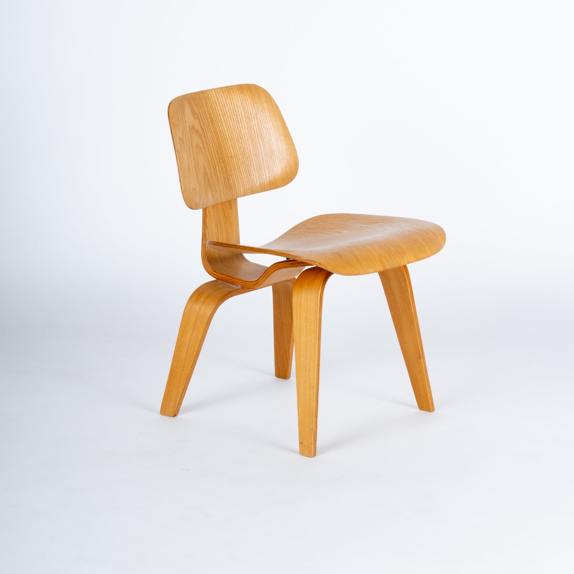 Own a piece of design history with this rare 1st generation pre production Eames DCW chair in Calico Ash, produced by Evans. This chair retains all original shock mounts with washers with the wood in excellent condition. Despite missing the original stickers (which fall off easily), the 5-2-5 screw patter along with the lack of glides indicate that these chairs are from the 1st production run of the DCW in the mid 1940s. This chair came out of an Eichler home in Northern California. Nationwide shipping available. Please contact with questions prior to purchase. All sales final.