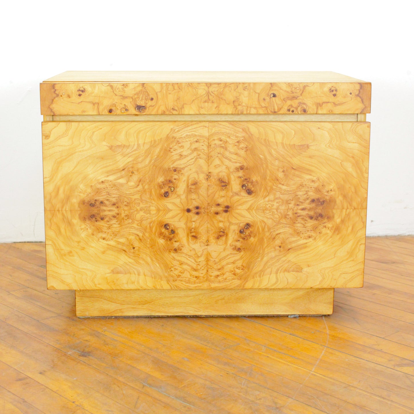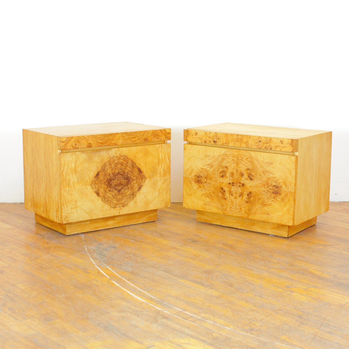 Burly burl. Pair of burl nightstands by Roland Carter for the Lane “Alpha” line. Refinished. Some small veneer patches shown in photos. Please contact for shipping and local delivery arrangements before purchase. All sales final.
