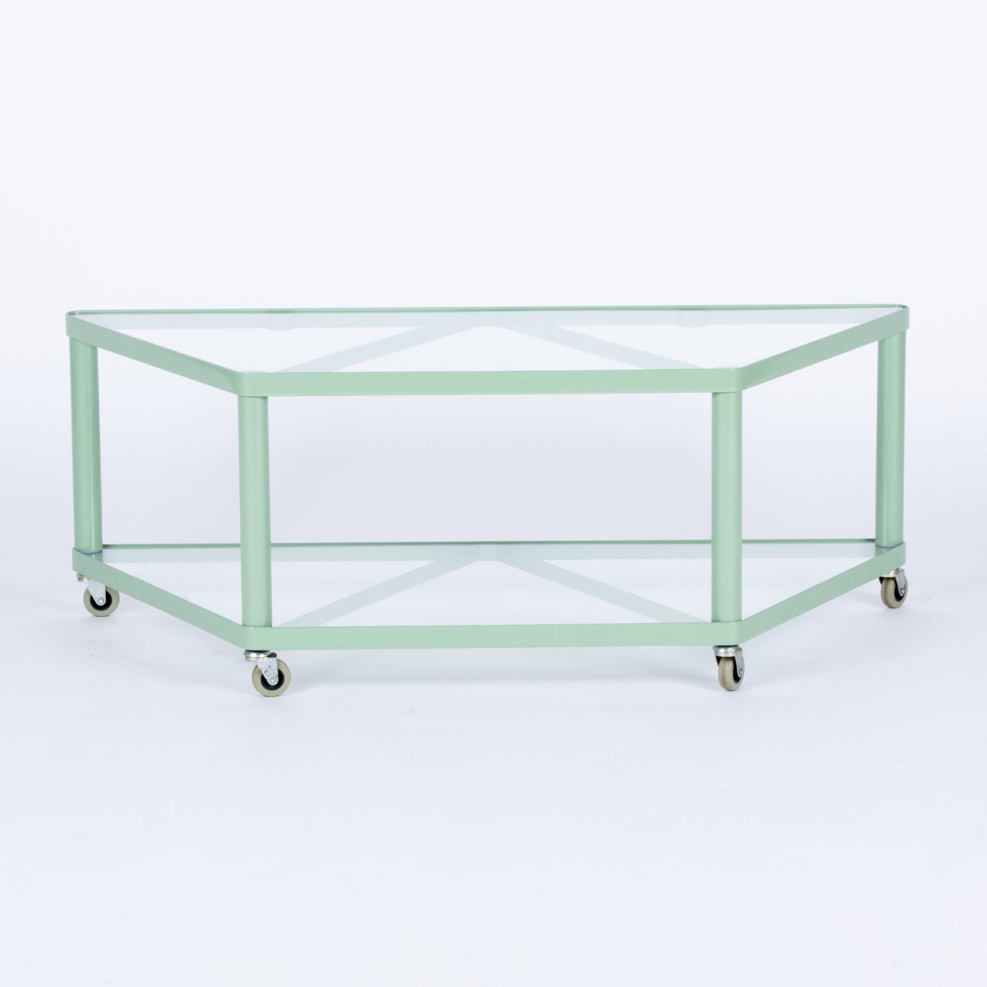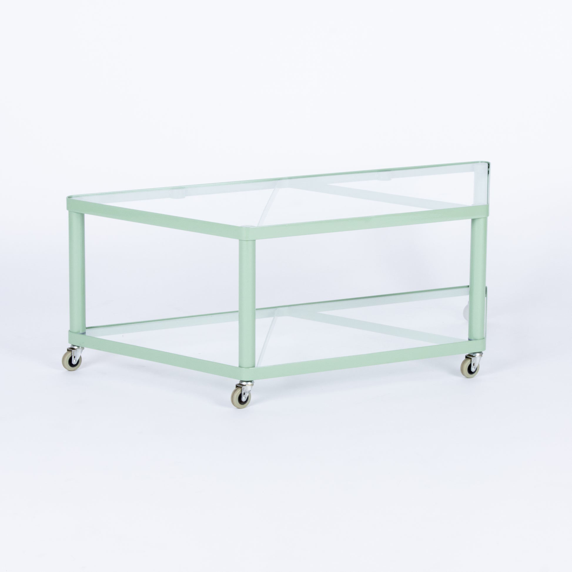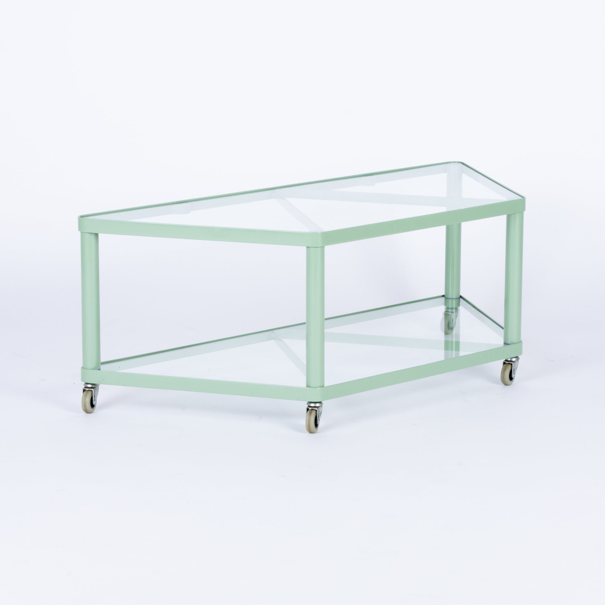 1999 IKEA Dalfors rolling table or media cart. Custom powder coated in a soft mint green. Please contact for questions, appointments, shipping and local delivery arrangements prior to purchase. All sales final.